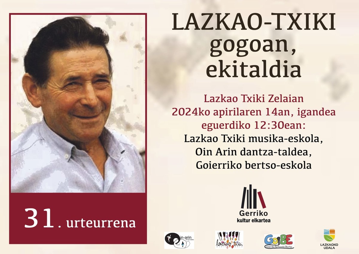 HOMENAJE A LAZKAO TXIKI 31 ANIVERSARIO 14 Abr 2024 12:30 – 14:00 Ubicación: Lazkao Txiki plaza, Lugar Lazkao Txiki plaza, Lazcano, País Vasco, España HOMENAJE A LAZKAO TXIKI 31 ANIVERSARIO 14 de abril a las 12:30 en la Plaza Lazkao Txiki