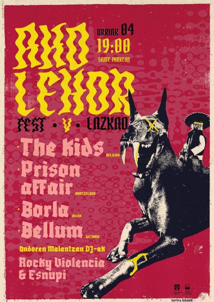 V. AHO LEHOR FEST 04 Oct 2025 19:00 – 23:30 Ubicación: Skate Park, Lazkao, País Vasco V. AHO LEHOR FEST 4 de octubre a las 19:00 en el Skate Park (si el tiempo no acompaña se hará en el frontón) The Kids (Belgium) Prison Affair (Bartzelona) Borla (Iruna) Bellum (Getaria)