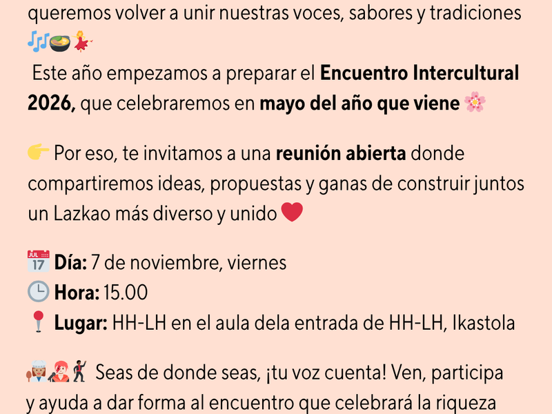- La reunión tendrá lugar a las 15:00 horas, en el aula de entrada del edificio EI-EP de la Lazkaoko Ikastola.
