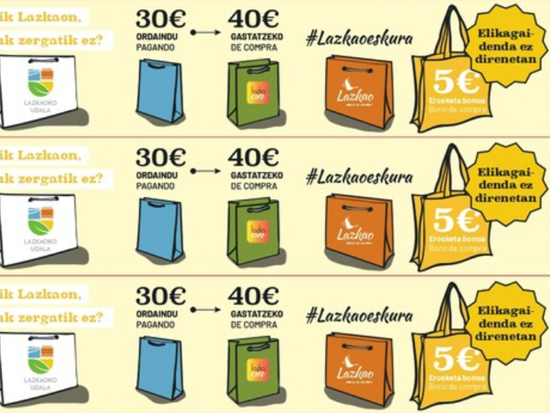 - La carpa estará instalada de 17:00 a 19:00 horas para adquirir los primeros bonos de la campaña “Nik Lazkaon, ¿zuk zergatik ez?”, una iniciativa para apoyar al comercio local y fomentar el consumo en el municipio.