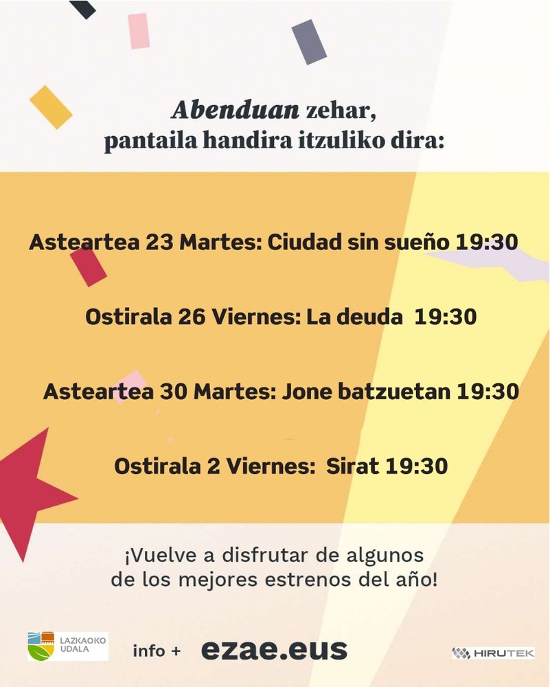 - Larunbata 13: 19:30 eta 22:00