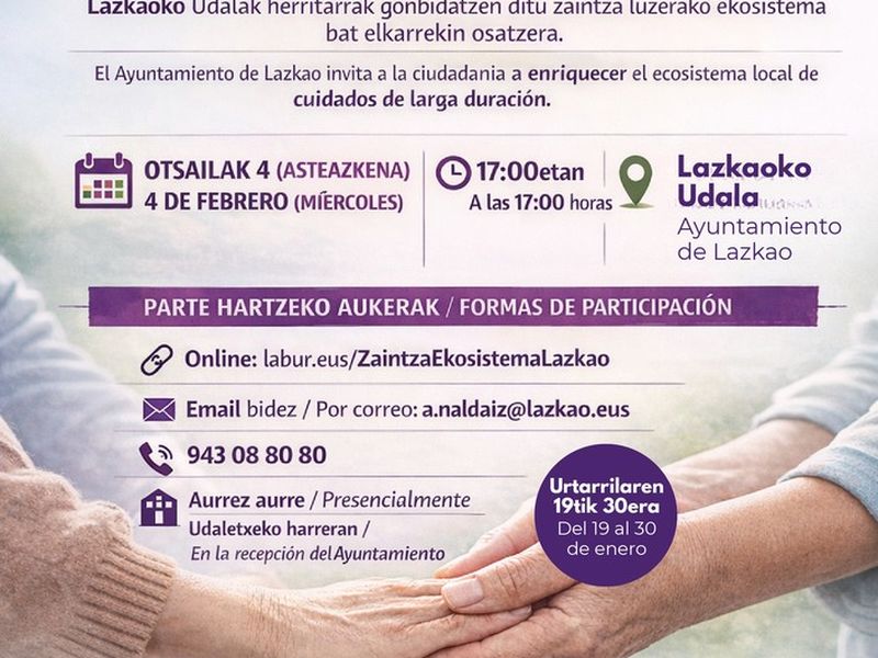 Ekimenaren helburua da udalerriko iraupen luzeko zaintza eredua modu parte hartzailean diseinatzea, herritarren funtsezko proposamenak bilduz, Lazkaoko beharretara egokitutako plan bat egiteko. Parte hartze prozesuak aurrera egingo du datozen hilabeteetan, diagnostikoan, beharren analisian eta Lazkaoren etorkizunerako zaintza plan baten sorreran oinarritutako saioekin.